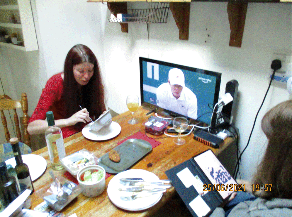 The women are now relaxing: June in Kitchen watching Live Tennis from Eastbourne on Prime & playing Nanogram;