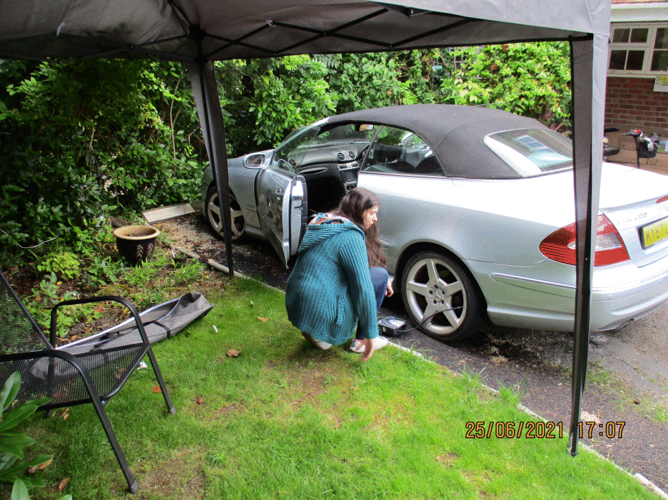 Samantha had to borrow his stuff to pump up her low tyre, then get the car started, to charge the battery :-)