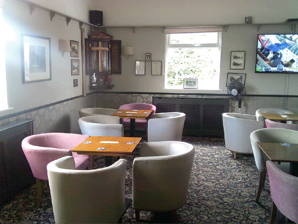Tap or Click on pictures to expand. e.g. views as you enter from front door. From left: memorial in corner; TV ; start of bar. That's Don puring a drink :-)