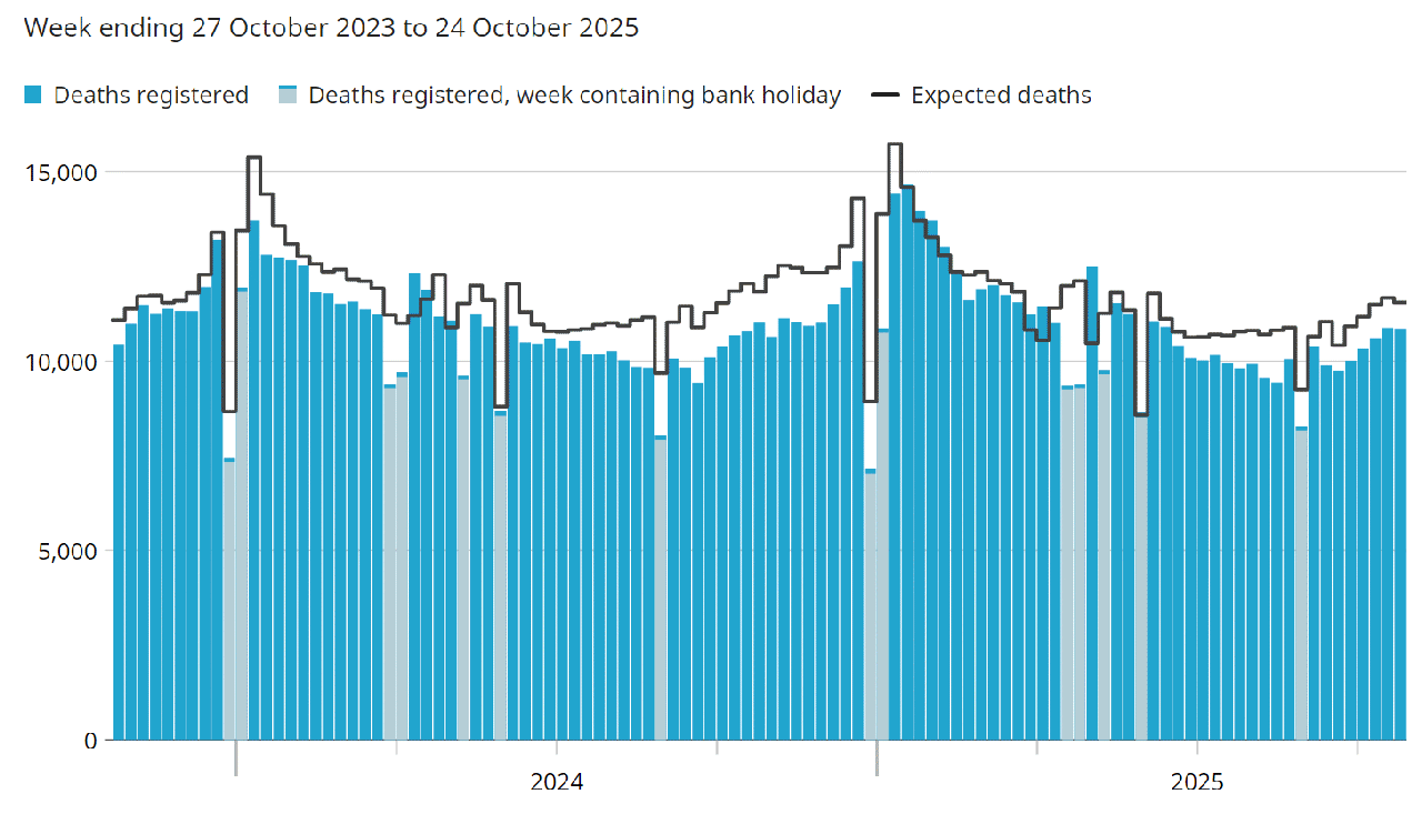 Tuesday 3rd November 2020: The ONS switch to publishing seperate graphs for England and Wales, instead of the combined graph since April.