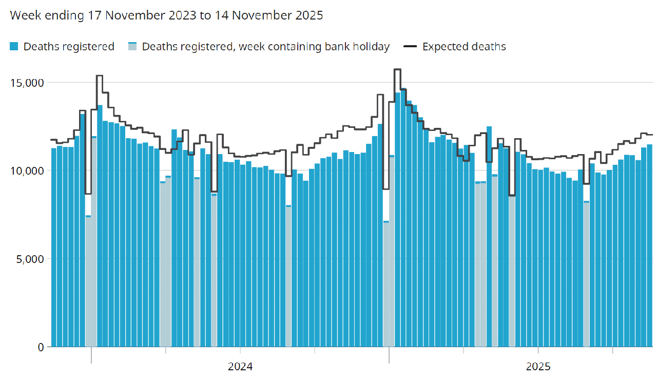 weekly ONS graphs of Total Deaths from April 2020 until Tuesday 24th November 2021.