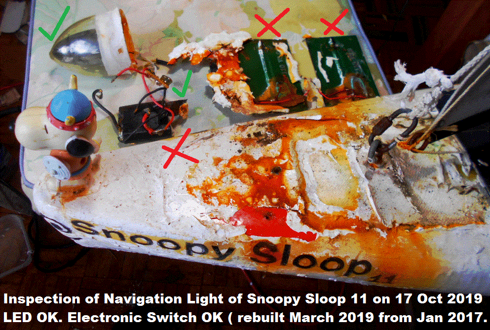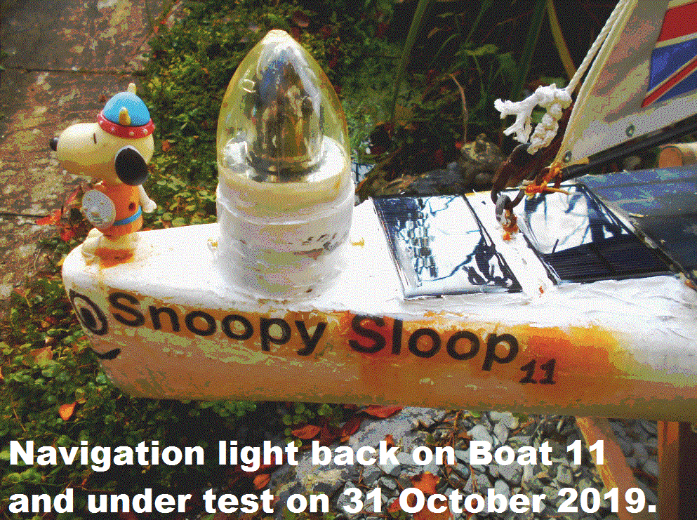 Thursday 17th October 2019: Click on pictures to enlarge. Stripping apart Snoopy's solar powered navigation lamp revealed wiring, the two small solar panels, and 3-cell battery pack, need replacement. However the LED lamp itself, and the electronic switch, seem OK. Robin's desk diaries back to 2016, and Blogs proved their worth. e.g. Search on "lamp" to find the January 2017 work in BlogX , but particularly the words and pictures above, in this Blog7, for Wednesday 6th March . Thursday 31st October 2019: Navigation light reassembled and solar panels glued back on boat with white silicon sealant.
