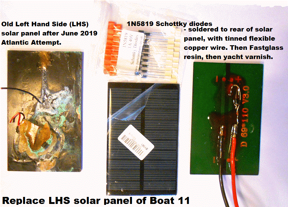 Tuesday 29th September 2020: "Snoopy Sloop" stickers have not arrived yet, but the picture below shows important work on re-wiring has started. The brass bolts should be more suitable than those nickel plated steel bolts. The solar panels are now wired through to the 5v 4xAA NiMHd battery packs. The LHS and RHS are duplicated: each two 5v packs in parallel. Now major work is needed in re-wiring towards the rear, including use of Schotsky diodes to combine LHS and RHS 5v supplies, and wiring through the duplicated power switches at the rear. This power is fed into the Picaxe Autopilot computer, but also used as a backup to the SPOT Trace power, which has it's own 5v pack. LOTS to do carefully, including checking for dry soldered joints !