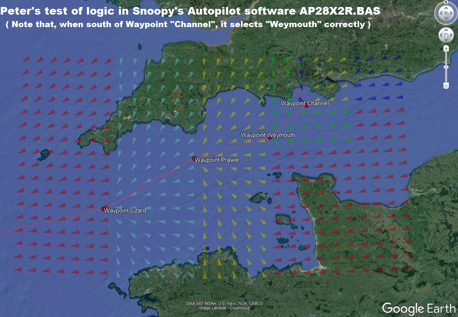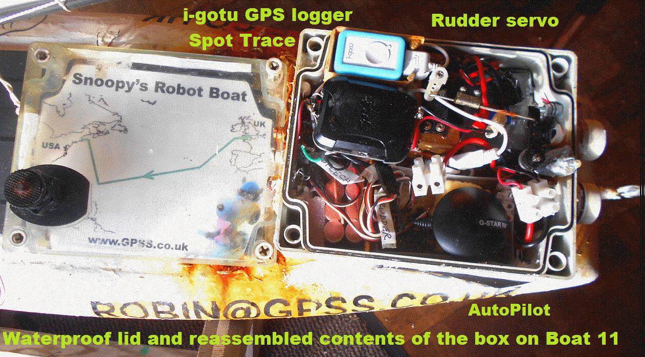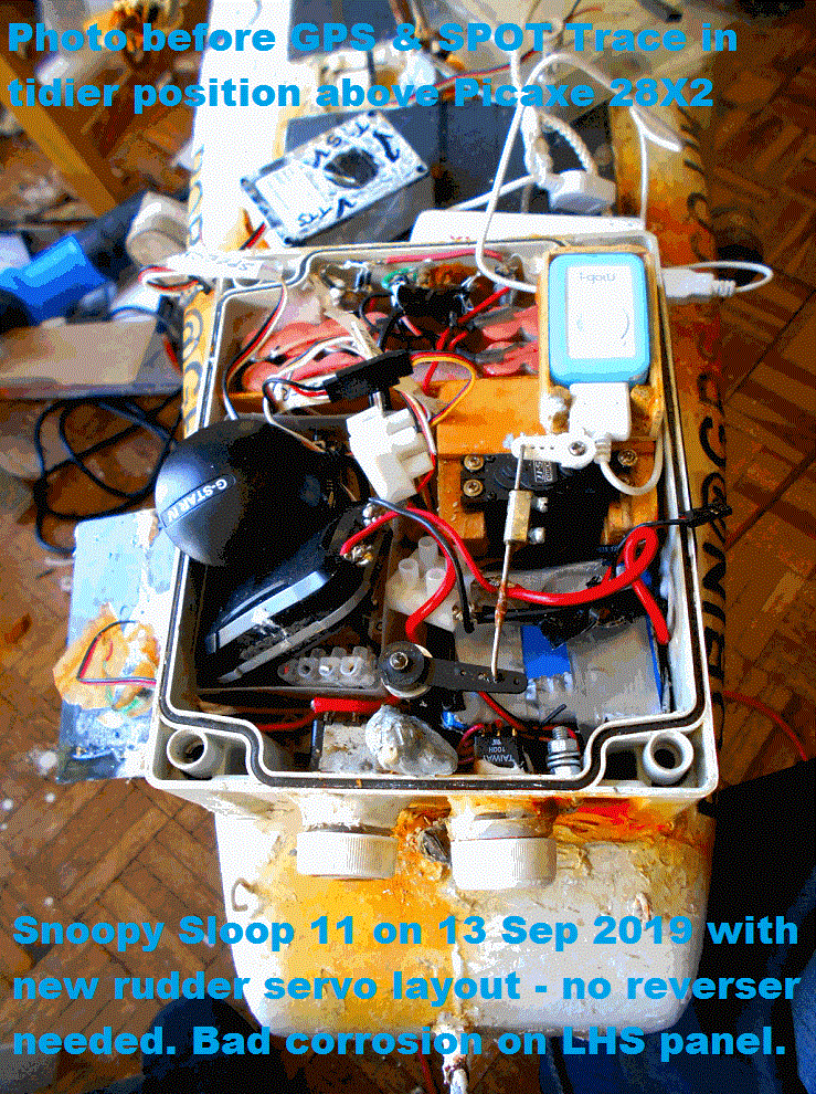 4th September 2019: This documents test and repair work on Snoopy's Boat 11, after that "Good" June 2019 Atlantic Attempt. Snoopy certainly surprised us, yet again, in racing Dick south, to the French coast, near Cherbourg, then returning north to end his adventure in Lulworth Cove. Robin's best guess at an explanation, of why Snoopy was not simply been swept westward, by the strong wind, was we must have a remarkably well balanced boat, with lots of "weather helm". We don't know when Snoopy's Boat 11 lost it's rudder, but with hindsight, it was a daft idea to use carbon fibre rod. It now has spring steel ! Thanks Peter for the check on the Autopilot software AA28X2R.BAS , to give us confidence that the autopilot would have being try to steer westward, after getting south of the "Channel" waypoint. Perhaps the boat was rudderless long before then ? Click on pictures to enlarge.