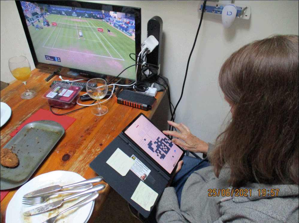 The women are now relaxing: June in Kitchen watching Live Tennis from Eastbourne on Prime & playing Nanogram;