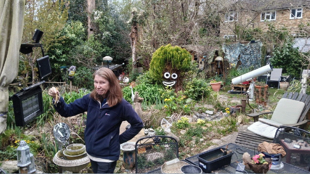 Robin and June pose proudly beside the Spaghetti Tree in their back garden
