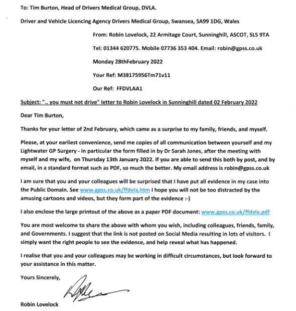 To: Tim Burton, Head of Drivers Medical Group, DVLA. Drivers Medical Group, Swansea, SA99 1DG, Wales.