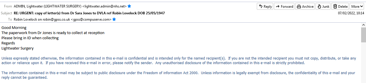 5. Email sent to Lightwater Surgery requesting copy of their letter to DVLA on Saturday 5th February 2022.