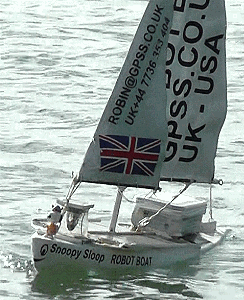 Note added in June 2014. The rest of this page was written last year, before we had found the causes of Snoopy Sloop 9 sailing so erratically compared with the boat used in the previous year's attempt. The conclusion in June 2014, after weeks and months of tests and changes to the rescued boat 9 (which becomes boat 10 for 2014) is that the problem was some unknown combination of: the rudder having slipped from it's correct, central position, and balance of the boat, including things like mast position, position of the rudder, and degree of rudder "gearing". It could have been a combination of these, or just one thing. e.g. the grub screw coming loose that holds the servo linkage arm to the rudder post ! One thing is for sure: in early 2013, we should have done more thorough functional tests, using the "Bray Lake Test", including sailing in all directions relative to a strong wind - before we rushed into the required 24/7 reliability tests !