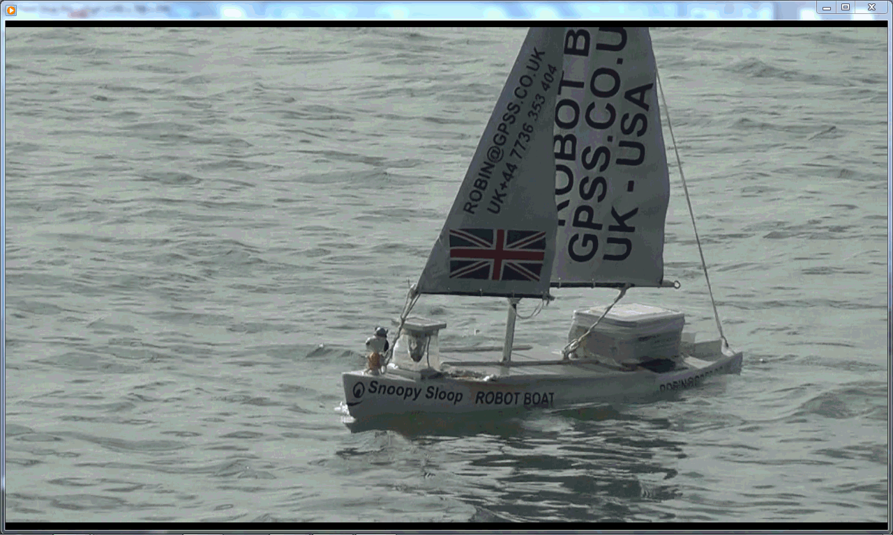 The blog mentions a "Bray Lake Test" : "Friday 14th June: Snoopy was pining for Bray Lake, so he was given a test sail, around the usual "Bray Lake Test" waypoints, in a southerly wind of about 15 to 20mph. As expected, he took ages (45 mins?) to reach the first waypoint, almost directly upwind, but then returned much faster, within maybe 15 minutes, and within a metre of his base." The picture on the right was taken during this test, and a video was put up then. You can play the 2 minute Video of June 2013.