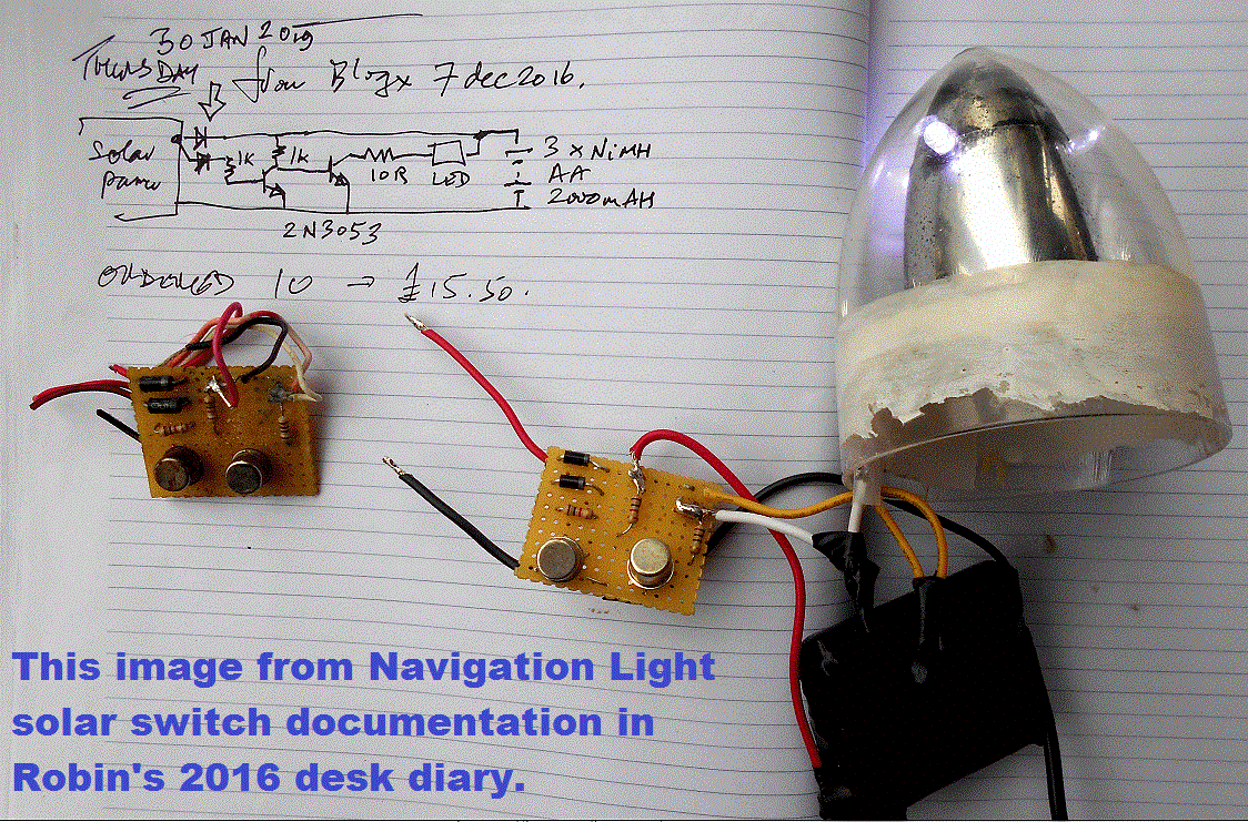 Thursday 17th October 2019: Click on pictures to enlarge. Stripping apart Snoopy's solar powered navigation lamp revealed wiring, the two small solar panels, and 3-cell battery pack, need replacement. However the LED lamp itself, and the electronic switch, seem OK. Robin's desk diaries back to 2016, and Blogs proved their worth. e.g. Search on "lamp" to find the January 2017 work in BlogX , but particularly the words and pictures above, in this Blog7, for Wednesday 6th March . Thursday 31st October 2019: Navigation light reassembled and solar panels glued back on boat with white silicon sealant.