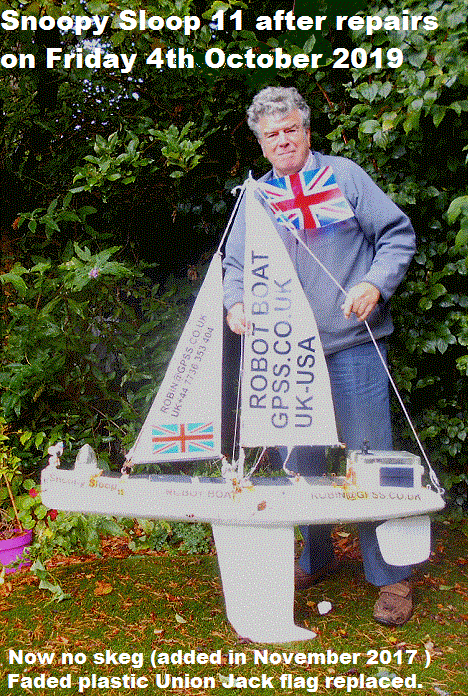 4th September 2019: This documents test and repair work on Snoopy's Boat 11, after that "Good" June 2019 Atlantic Attempt. Snoopy certainly surprised us, yet again, in racing Dick south, to the French coast, near Cherbourg, then returning north to end his adventure in Lulworth Cove. Robin's best guess at an explanation, of why Snoopy was not simply been swept westward, by the strong wind, was we must have a remarkably well balanced boat, with lots of "weather helm". We don't know when Snoopy's Boat 11 lost it's rudder, but with hindsight, it was a daft idea to use carbon fibre rod. It now has spring steel ! Thanks Peter for the check on the Autopilot software AA28X2R.BAS , to give us confidence that the autopilot would have being try to steer westward, after getting south of the "Channel" waypoint. Perhaps the boat was rudderless long before then ? Click on pictures to enlarge.