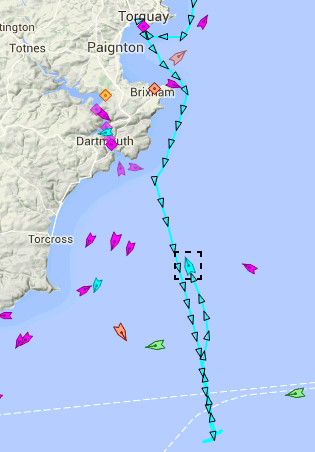 From Peter (of Team-Joker) morning of Friday 8th July: Brown bands are shipping lanes from marinetraffic. You can see she's quite near the Channel lightvessel and, at point of closest approach, was 3.74 nm from it. I guess even if there was a web cam on the lightvessel we wouldn't have seen her. Nice one Peter !