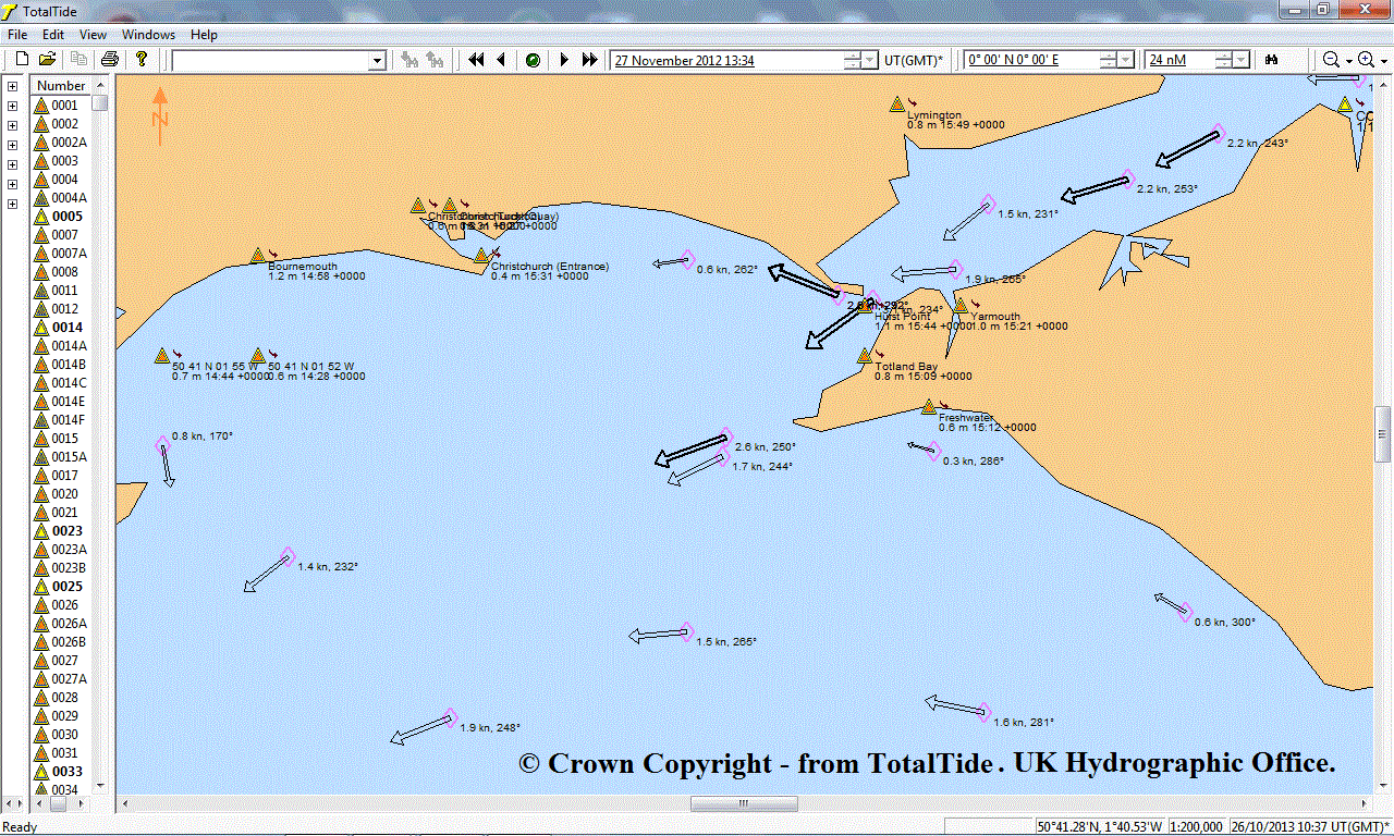 The TotalTide HO Model could not be easier to use: just type in a year, date and time, choose the map area, and there you see the calculated speed and direction of tidal current flow. Click on the chart on the right, to see TotalTide screen output clearly - for 13:34 on 27th November 2012, when Snoopy started to stray from his straight line path.